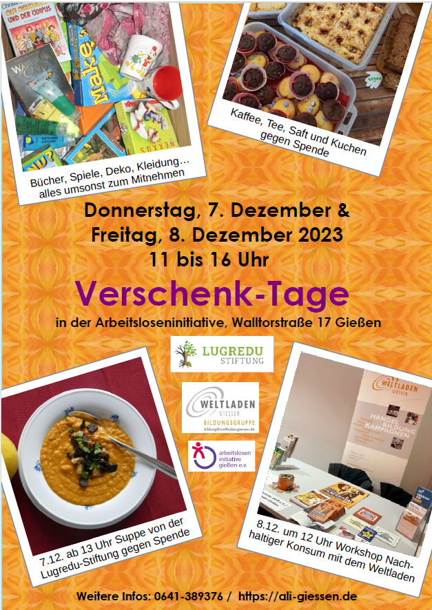 Mit zwei Verschenk-Tagen möchte die Arbeitsloseninitiative Gießen e.V. einerseits Menschen unter die Arme greifen, die sich sonst nich viel leisten können und gleichzeitig zu mehr nachhaltigem Konsum anregen möchten. Bei Kaffee und Kuchen kann zwischen Artikeln gestöbert werden. Am 7.12. wird die Arbeitsloseninitiative durch Suppe der Lugredu-Stiftung unterstützt, welche man gegen Spende erhält.