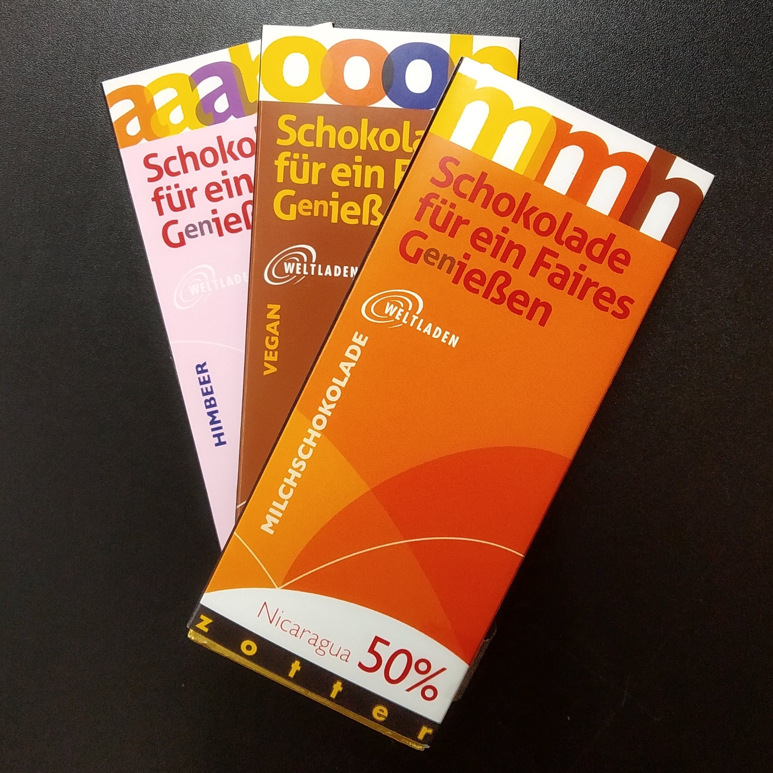 Hinzu kamen 2019 3 köstliche Schokoladen der Firma Zotter. Justus und seine süßen Schwestern sollen den Fairen Handel Gießens Bügerinnen und Bürgern im wahrsten Sinne des Wortes schmackhaft machen. Nach dem Motto: Schokolade und Kaffee für eine faires G(en)ießen! Von der Milchschokolade mit nicaraguanischem Kakao gehen 20 ct pro verkaufter Tafel an gipanic.